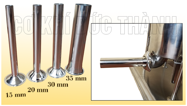 - Với 4 phễu đùn xúc xích có kích thước khác nhau: 15, 20, 30, 35mm bạn có thể nhồi được nhiều loại theo nhu cầu. Toàn bộ phễu đùn được làm từ Inox đảm bảo vệ sinh an toàn thực phẩm, dễ vệ sinh, bảo quản và bền hơn so với ống nhựa như trước đây.